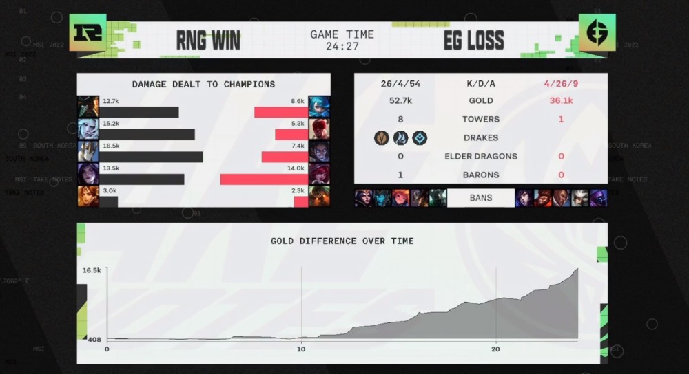 陷入巨大劣势的EG战队选择以打大龙的方式抓机会,又被RNG战队打出0换2,RNG回头趁EG战队抓边的时候正面拿下大龙,22分钟的时间节点,已经拿到了一万以上的经济优势。