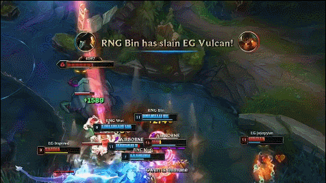 之后EG战队抱团来到中路抓机会,但是RNG战队直接去下路越塔击杀了霞,后EG交双TP支援但只击杀了一个辅助,小龙位置双方碰撞的结果中RNG击杀盲僧,总计打出1换2。