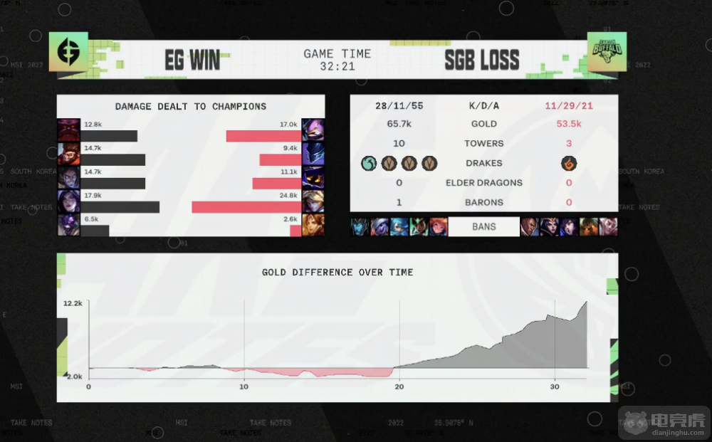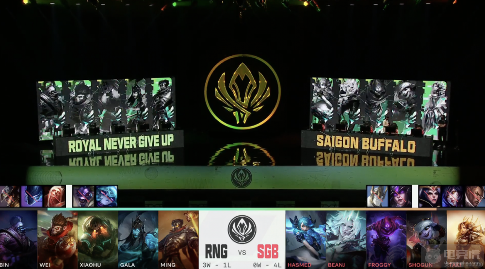 蓝色方RNG一抢打野猴子,选出滑板鞋+泰坦的下路组合;红色方SGB在counter pick位中选出辅助曙光女神,同时选择中单玛尔扎哈。开局双方思路明确,RNG将重心放在上半区,尽管小龙团战中SGB完成1换4将经济追回,但在后续运营中,RNG更胜一筹,有惊无险赢下比赛胜利。