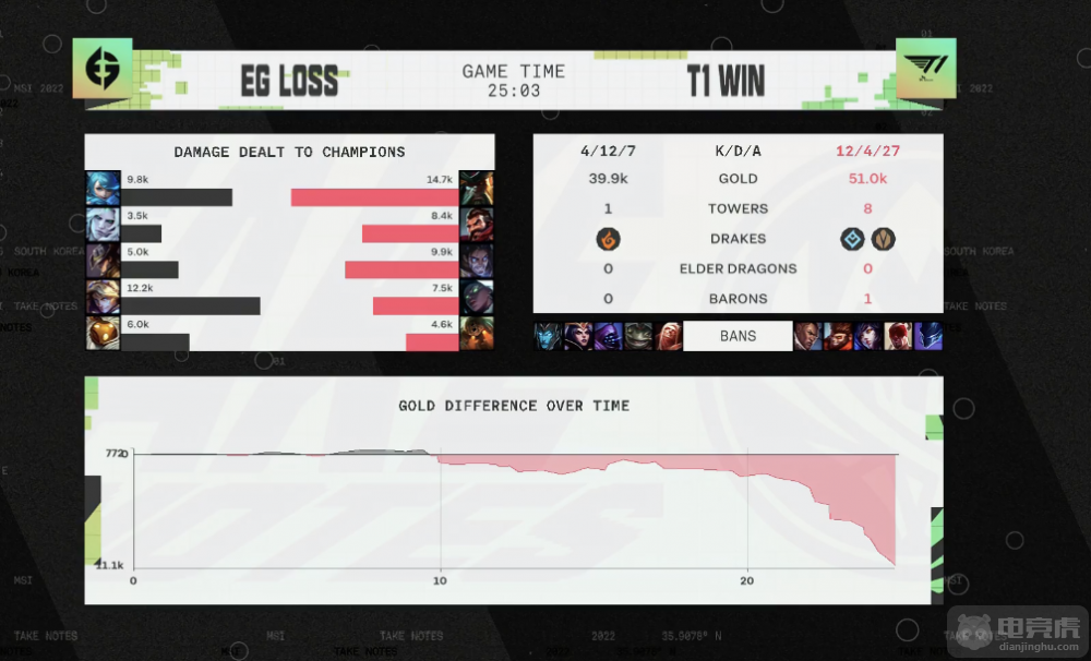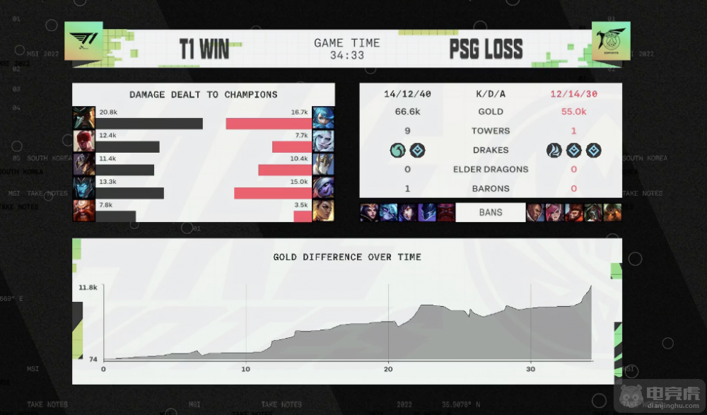 蓝色方T1一抢滑板下,选出滑板鞋+酒桶的下路组合;红色方PSG一抢小炮,形成泽小炮+芮尔的下路组合,将counter pick位给到上单选择格温。对线期T1将战术核心放在上路,Gumayusi成为了PSG的突破口。中期T1团战抓住机会团灭PSG,将经济差距拉开,通过经济领先在团战中取胜,赢下比赛胜利。