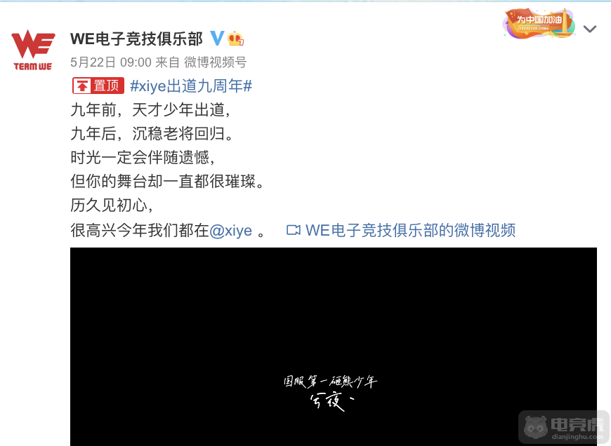 WE俱乐部发布视频祝贺xiye出道九周年: