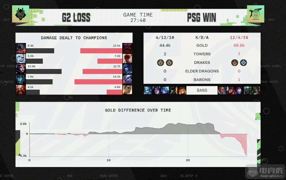 蓝色方G2一抢滑板鞋,随后选出了滑板鞋+酒桶的下路组合,红色方PSG将counter pick位给到辅助芮尔,下路形成小炮+芮尔的组合。这场比赛节奏相对较慢,双方陷入运营节奏中,并没有拉开明显的经济差距。最终决胜团战中,PSG完美分割阵型,赢下比赛胜利。