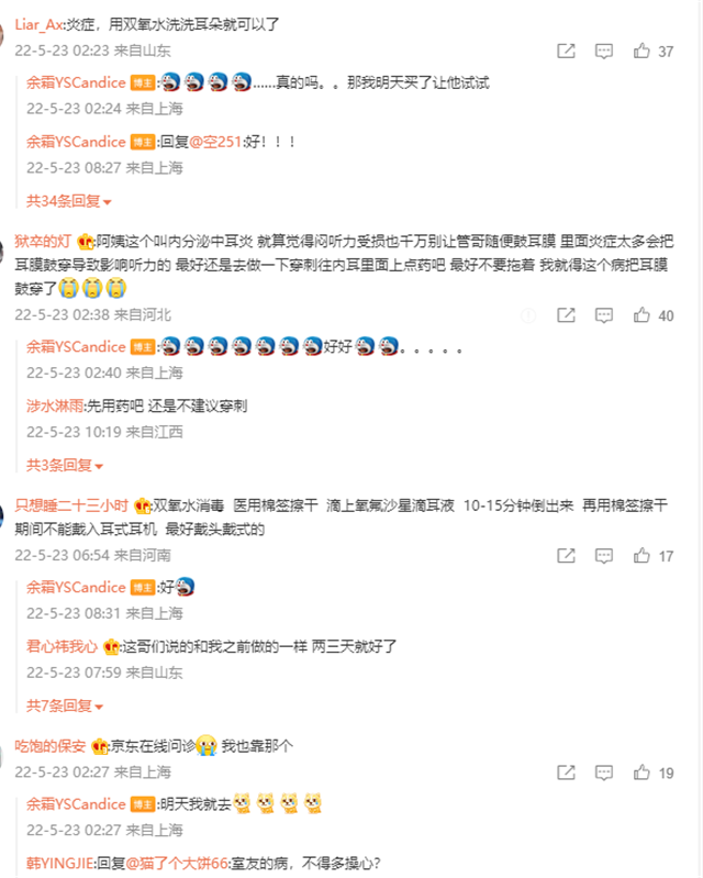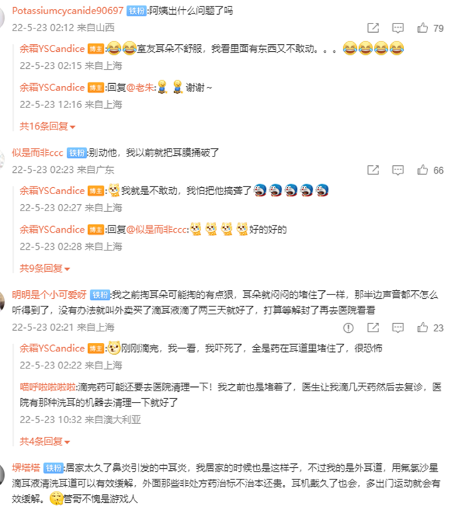 她表示,管泽元耳朵不舒服有一个月了,一开始她觉得只是普通问题,所以不太管没当回事。如今看了一眼管泽元的耳朵,发现里面堵塞了很多东西,滴了许多药也没用,只能求助于粉丝了。评论里的确有很多人出谋划策,大部分都是让余霜别轻举妄动,赶紧求医的。
