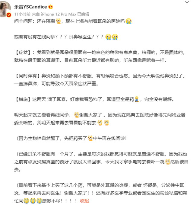 余霜发了一条很长的动态,把症状和自己的解决方式写出来,想问问观众这种情况怎么样,重的话她就带管泽元去求医。余霜字里行间表现出焦急,她的确很担心管泽元的身体情况。