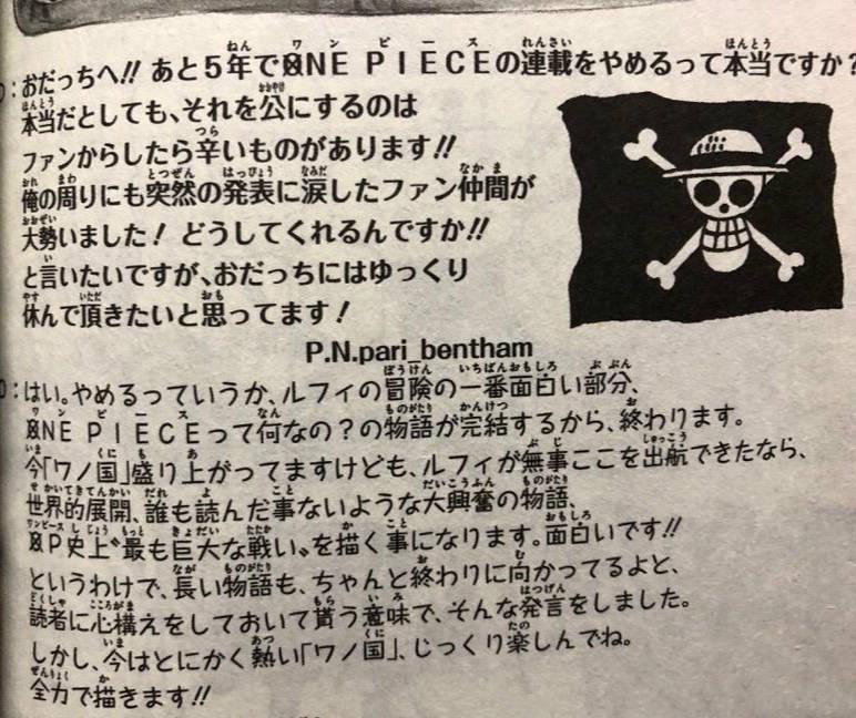但是,在97卷单行本SBS中尾田对粉丝提出的问题进行回答,详细解释他所说的【五年完结】一事。