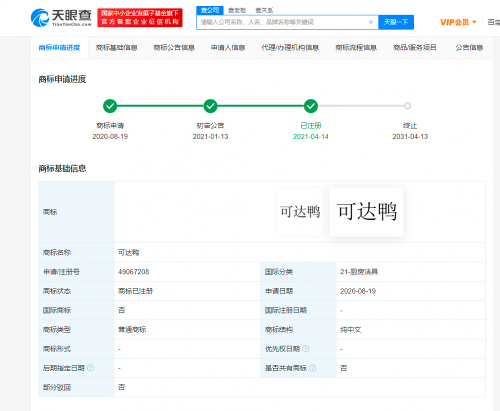 天眼查App显示,“可达鸭”商标被多家公司抢注,最早申请于2002年,申请人包括任天堂株式会社、武汉安凯欣商贸有限公司、鹿邑县万和天成网络科技有限公司等,其中有20余条相关商标已注册成功,国际分类包括广告销售、餐饮住宿、灯具空调等。