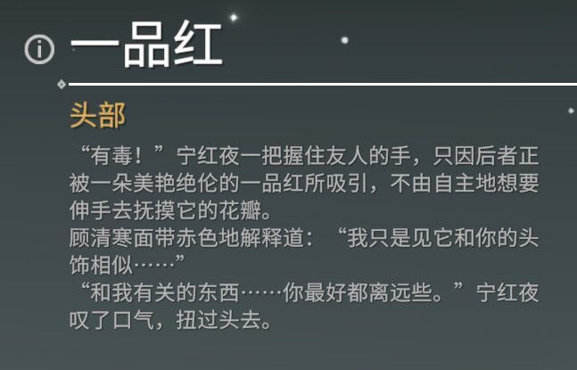 到了最近,又有玩家发现,新的服饰里面,居然有一件名为“一品红”的头部饰品里面,暗藏了一段关于宁红夜和顾清寒的对话。这其中明显暗示了两人的关系非常暧昧。顾清寒触碰一品红花瓣,然后又因为自己意图暴露而害羞,再加上宁红夜傲娇的拒绝,实在是让CP粉忍不住想要嗑起来。