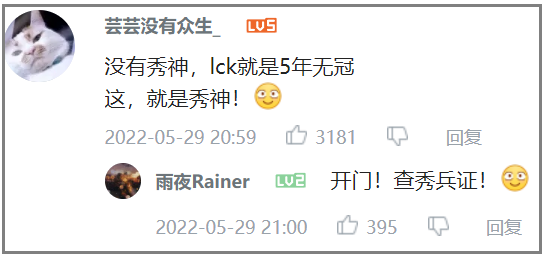 国内论坛不用多说了,各种讽刺韩国的表情包和用词也是层出不穷。我们此前写过的Showmaker贴吧吧主躺者如C借此机会扩大势力,现在你能在贴吧、B站、虎扑、微博等任何讨论LOL的地方看到有人亮出“秀兵证”。