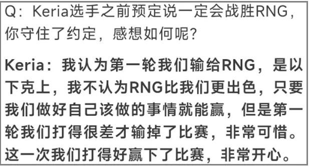 首先是大家喜闻乐见的垃圾话环节。决赛之前,T1战队从上到下似乎都对夺冠抱有百分之百的信心。先是辅助选手Keria在对抗赛第二轮复仇RNG之后,直称此前输给对手是“下克上”。