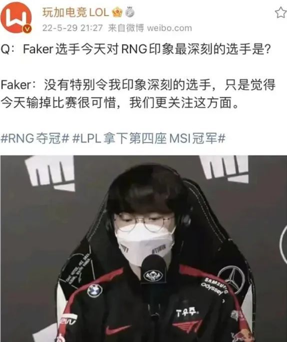 Faker也没有夸奖RNG任何一名选手,还再次提出比赛存在ping值问题。