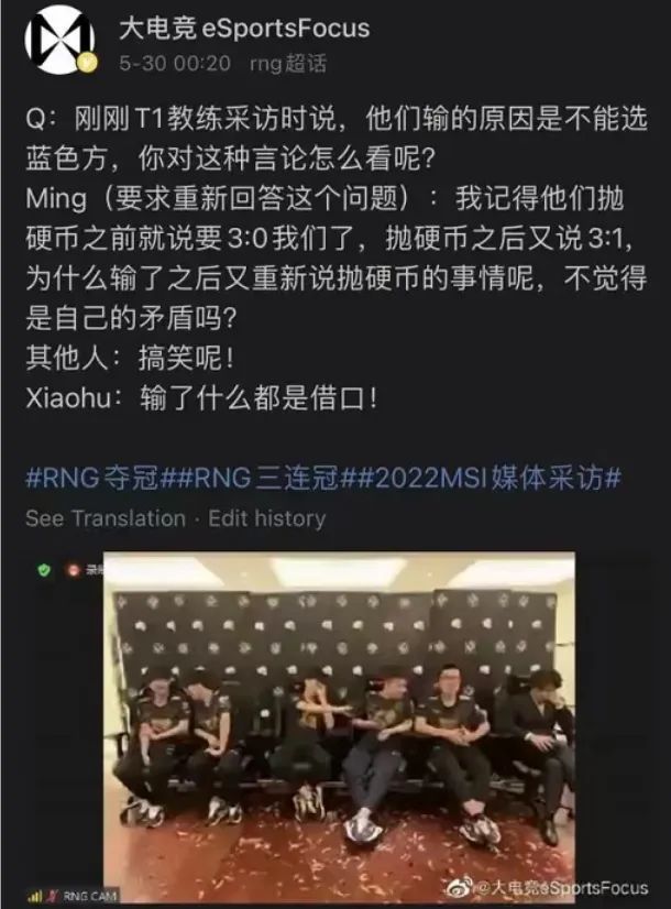 但当他们输掉比赛,赛后接受采访时依然嘴硬,就多少显得格局太小了。比如T1战队主教练,赛前自信满满说要3:0,输掉比赛后却甩锅给抛硬币。