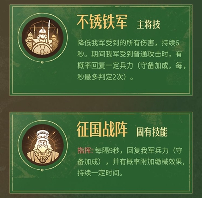 指挥:每隔9秒,回复我军兵力(守备加成),并有概率附加缴械效果,不断定时间。