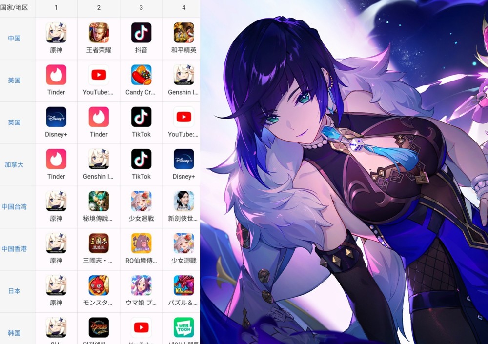 如果拿第一天的情况对比,国服夜兰起码比上一个池子“神里”的表现更好,但在海外的“夜兰”首日收入榜中(时差等因素存在),原神仅有8国登顶也是事实。