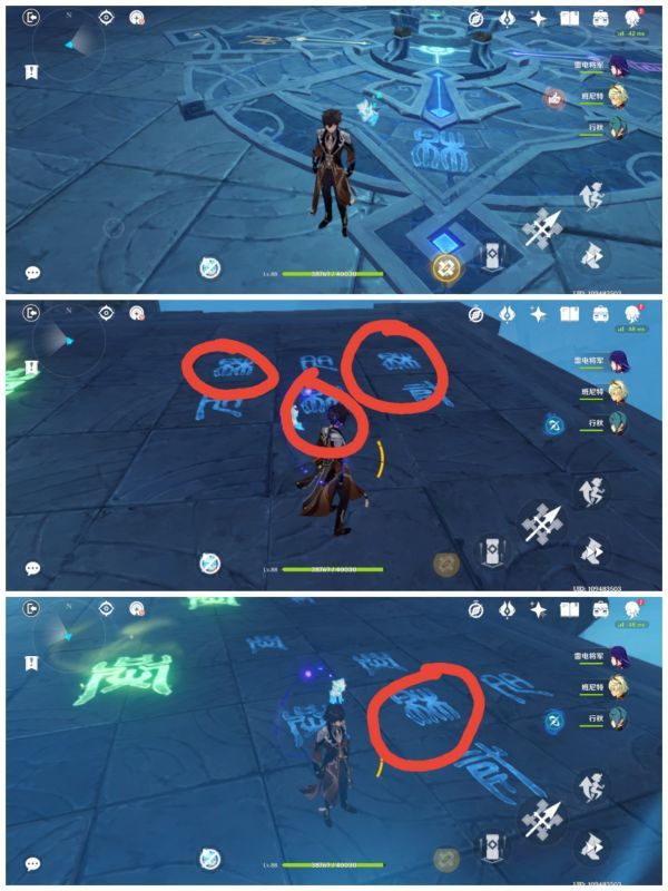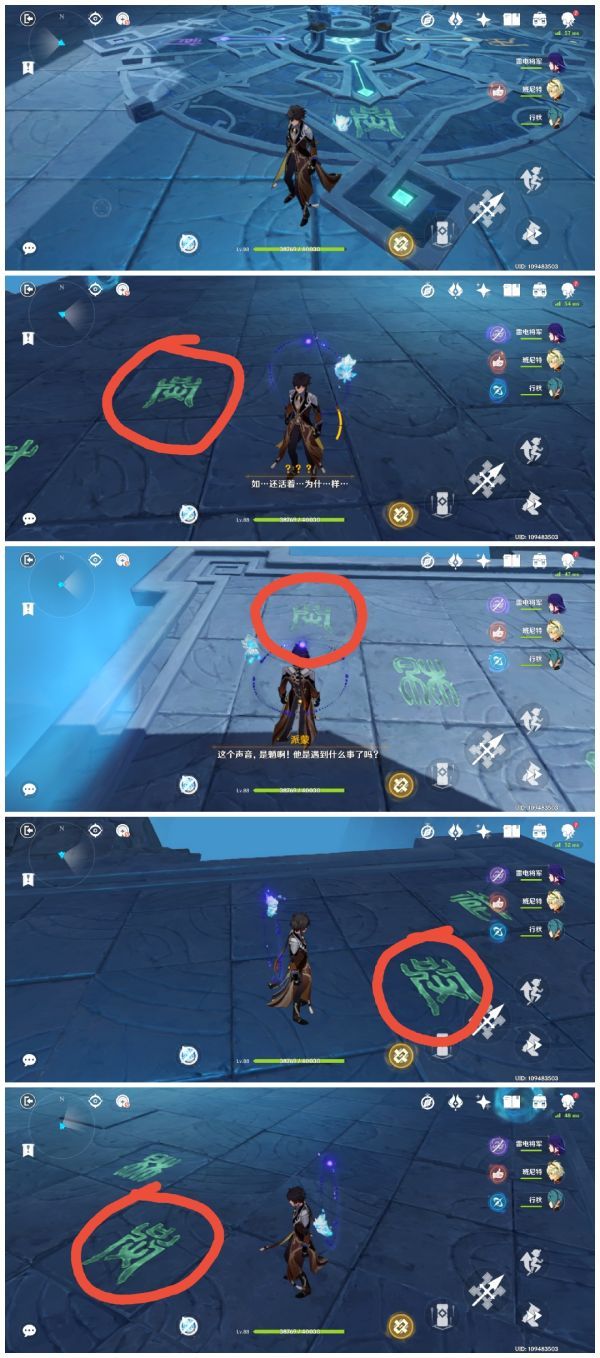 进入秘境之后,我们看到的便是这个类似于祭坛的东西,根据提示我们了解到,我们需分别将四个方向分别点亮,并且四个方向分别对应一个文字。注意,每一个方向都对应着一种怪物。