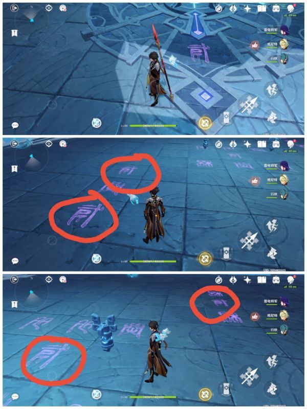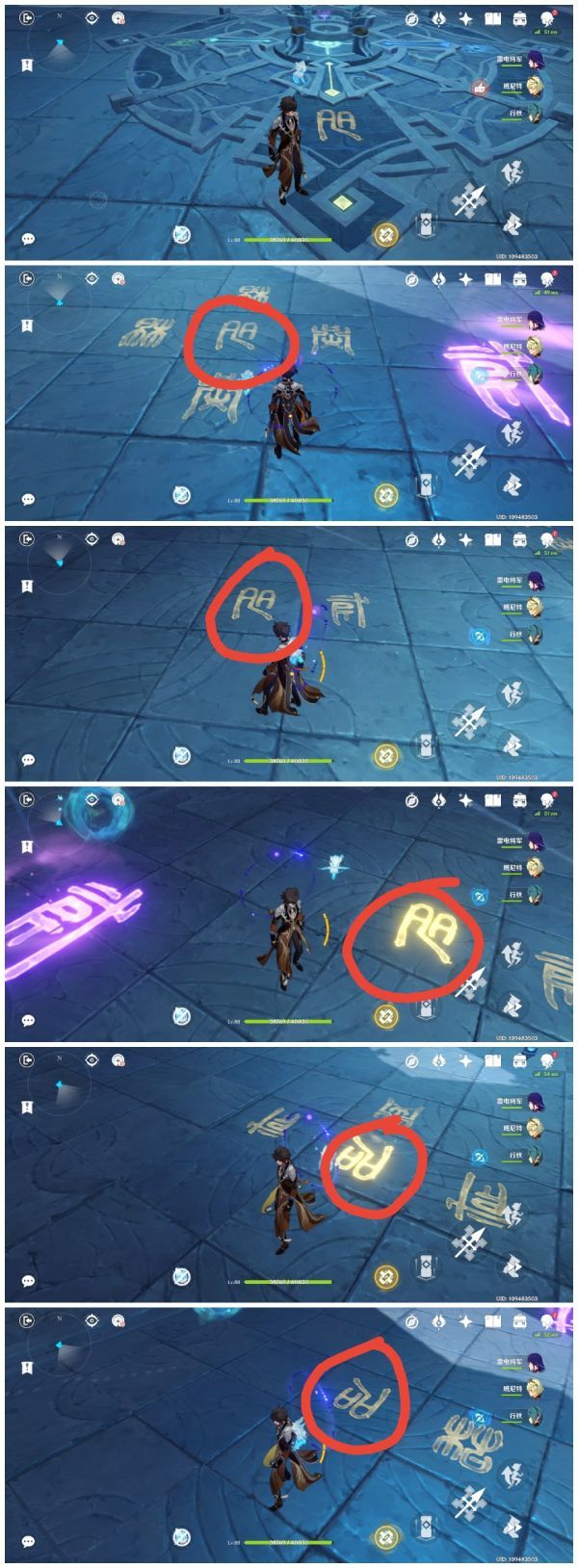 根据此前的提示,我们需先点亮紫色所对应的文字(踩相应的石块即可)