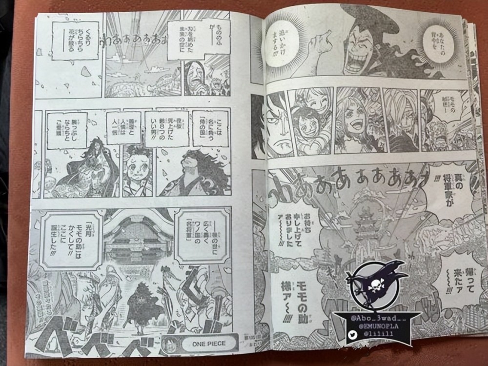 本周海贼王漫画1051话漫画终于更新,本话标题为“和之国将军·光月桃之助”,而这一话之中,光月桃之助也确实当上了和之国的将军,毕竟大蛇将军和凯多都被打败了。而扉页之中,杰尔马姐弟几人终于从大妈的地盘上打了出来。