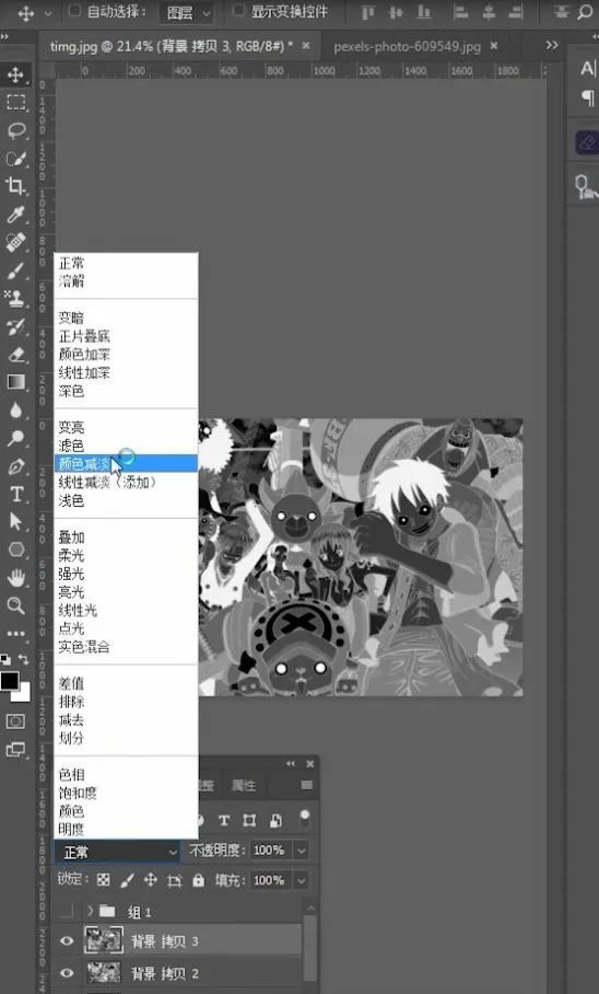 第二步,Ctrl+J 再复制一个背景图层,Ctrl+I 执行反向。在混合模式中选择颜色减淡。