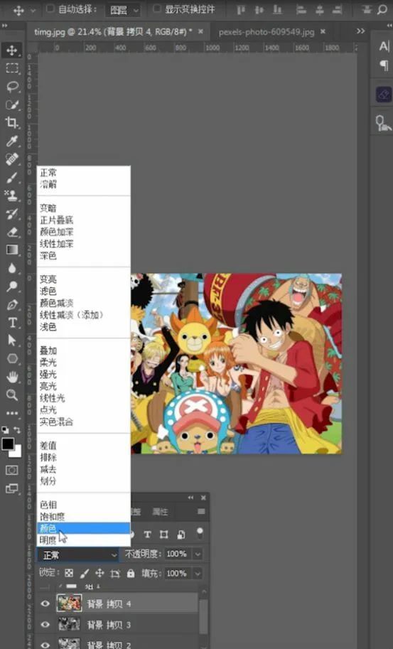 第四步,点击背景图层,Ctrl+J 复制一个图层,把复制的图层移动到最上方,混合模式选择颜色。