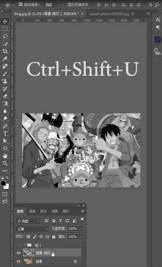 第一步,Ctrl+J 复制背景图层,Ctrl+Shif+U 给图片去色。