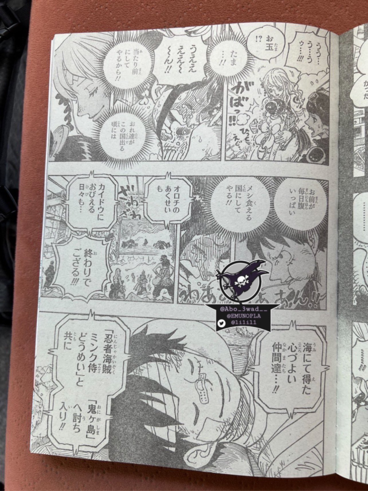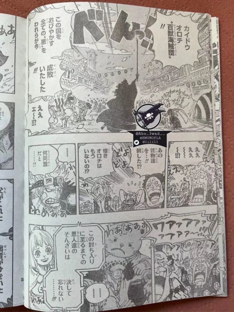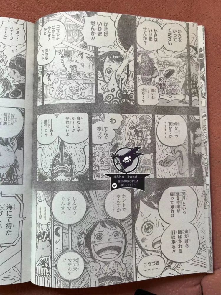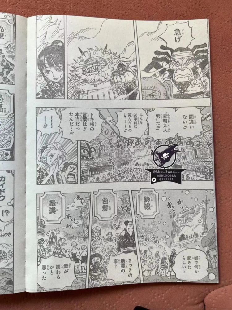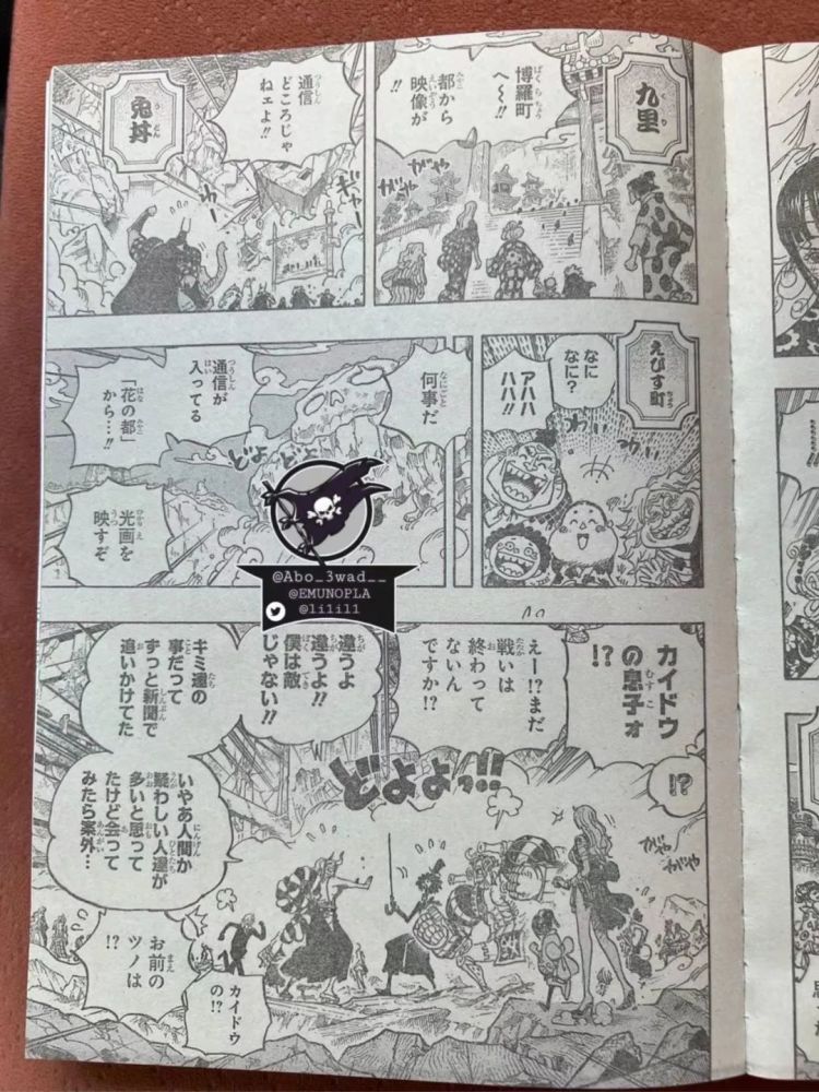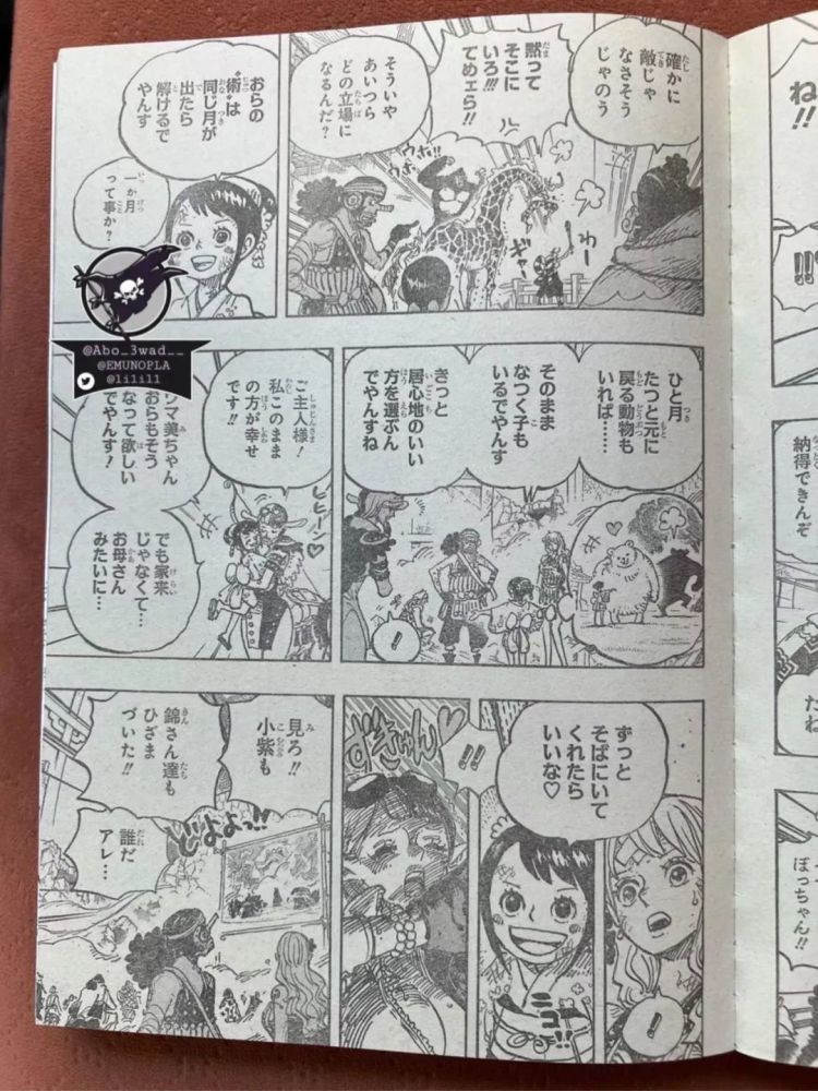 早前有情报师称「草帽一伙中罗宾和弗兰奇很开心;路飞昏睡但在微笑;索隆不省人事;山治和布鲁克爱心眼;娜美、乌索普、甚平和乔巴震惊」。但更可靠的情报师对此特别更正:弗兰奇没有表现开心、甚平没有表现震惊、乔巴没有说话因为他在治疗路飞和索隆。以此为准。