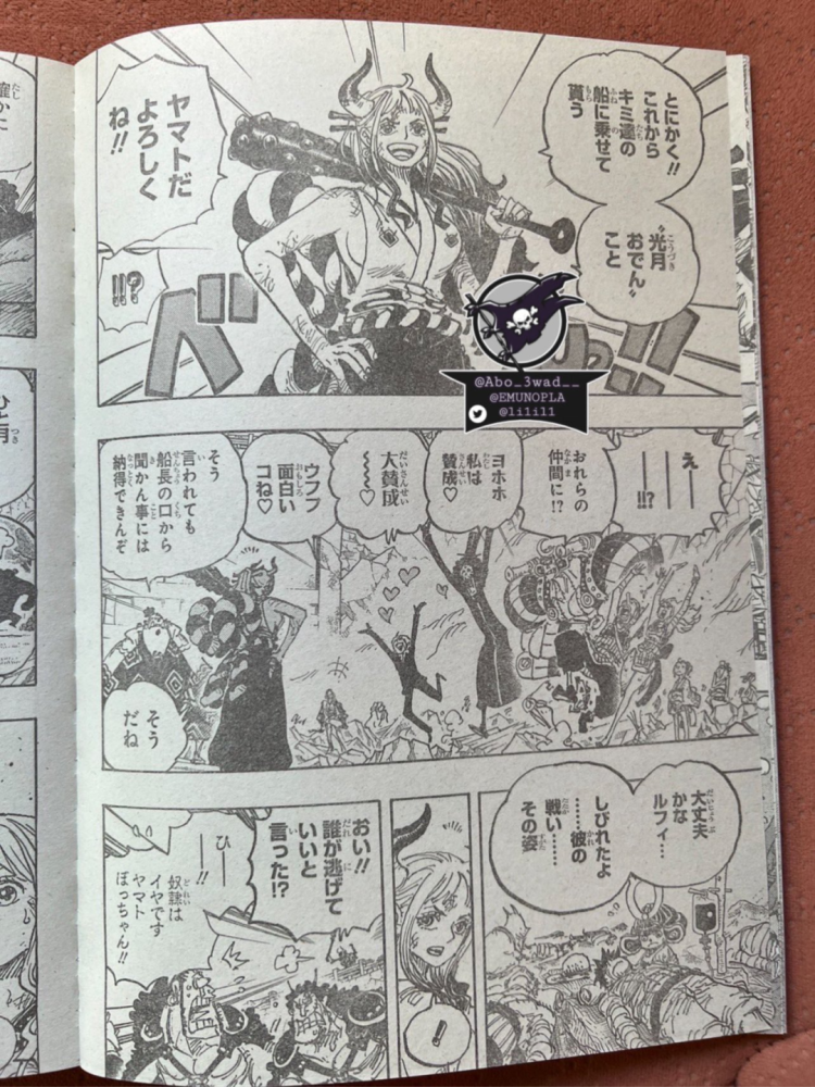 大和告诉草帽一伙她”光月御田”会上他们的船,一部分成员很开心一部分很惊讶。
