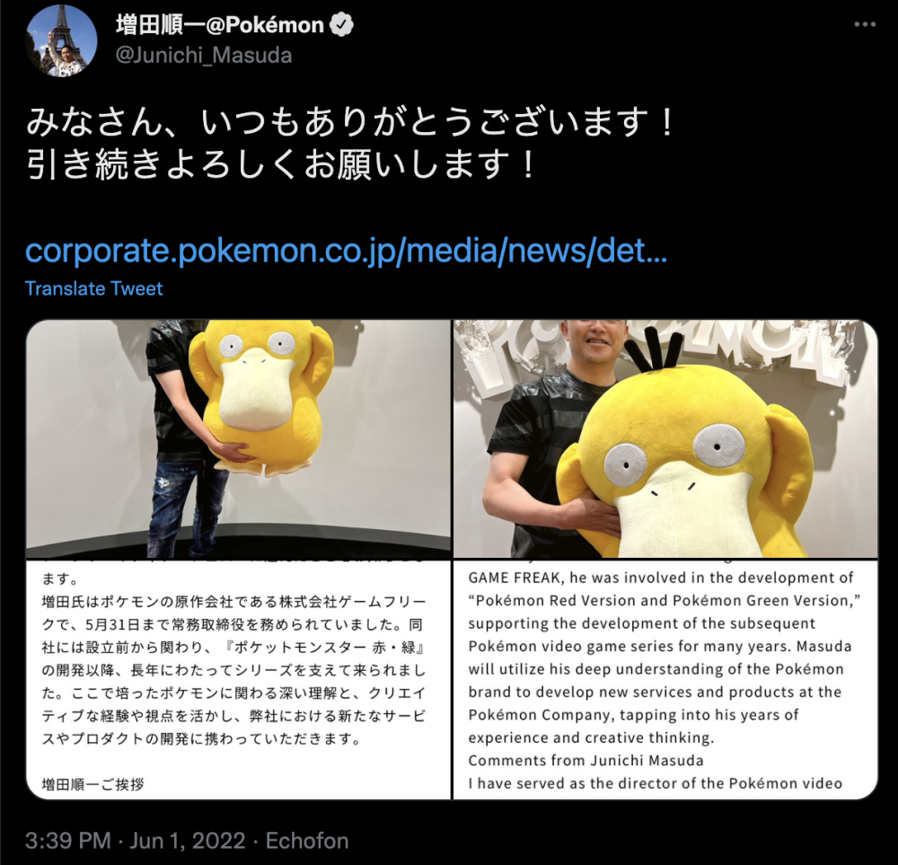 宝可梦(口袋妖怪)之父, Game Freak联合创始人增田顺一先生宣布他离开了该公司,但他仍将担任the Pokémon company的“首席创意员”。