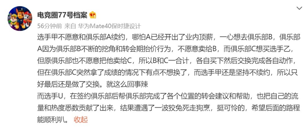 另外77号还给出另一个爆料,暗指的是Uzi选手,在转会期中帮助BLG完成各个位置的转会建议和帮助,也把流量和热度贡献出来了,结果遭遇了狡兔死走狗烹,挺可怜的。