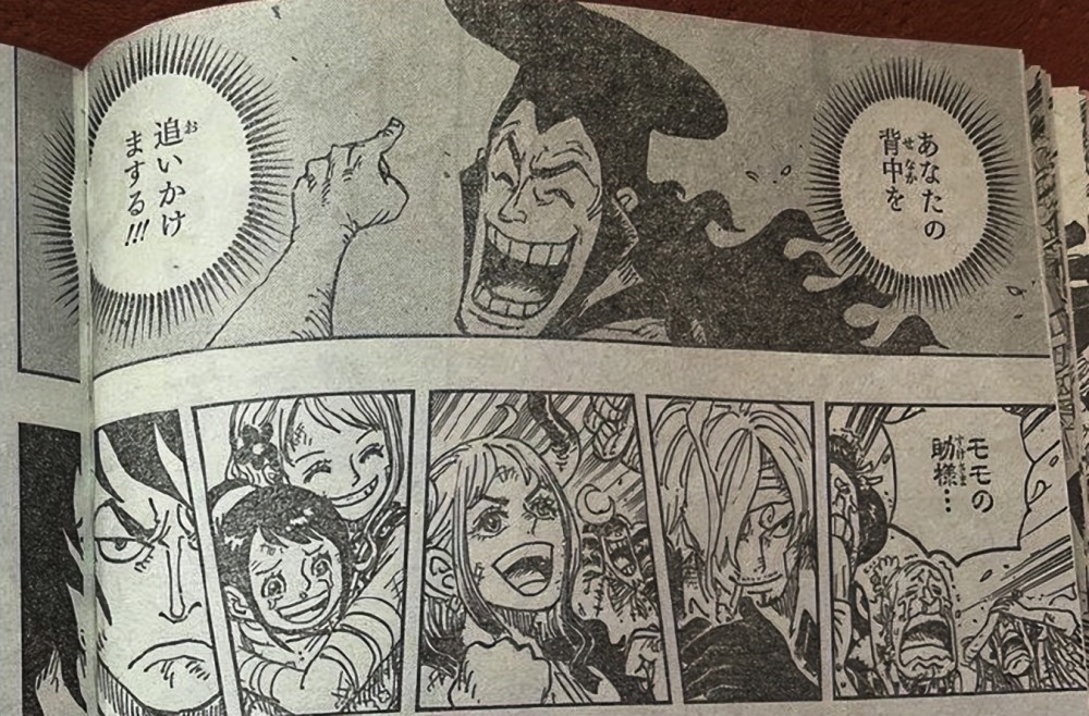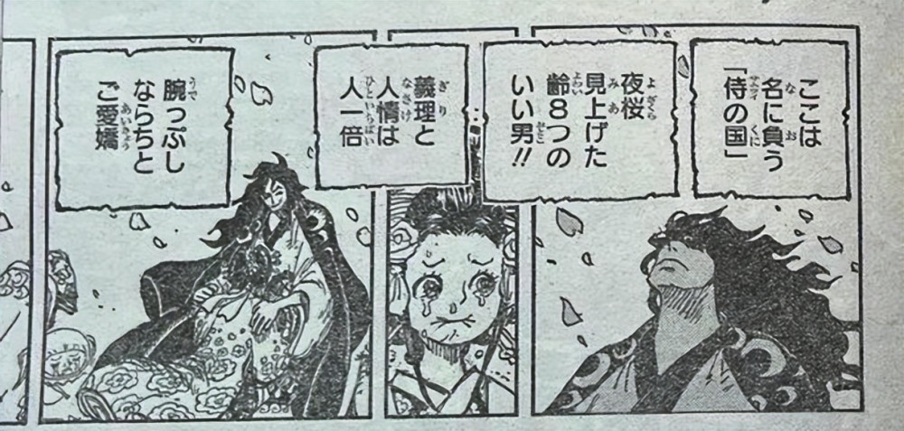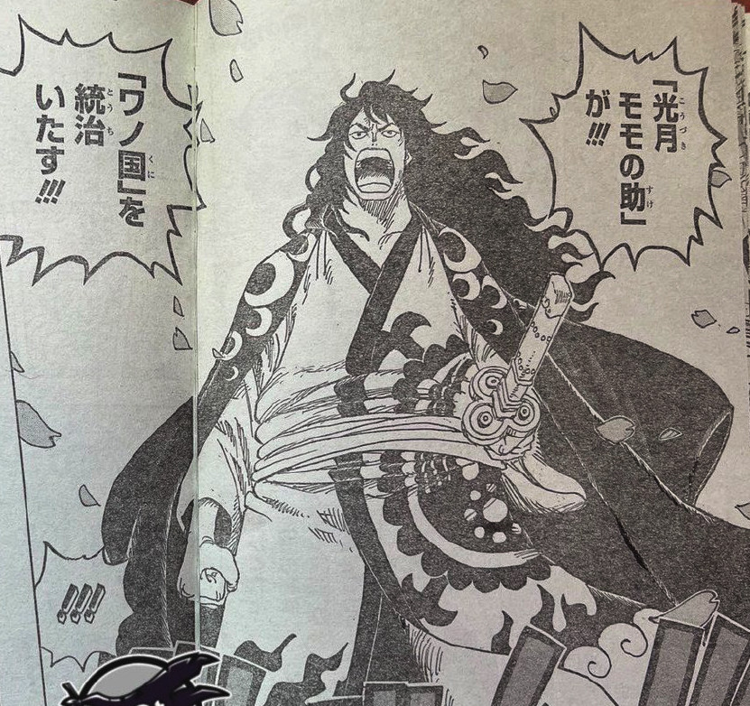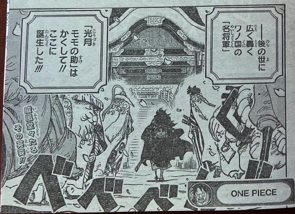 本话中,桃之助先是发表全国演讲,让和之国民众激动不已,毕竟是等待二十年的光复,谁也不曾相信四皇凯多就此落败。而桃之助本人更是佩戴天羽羽斩,并且以成年姿态示人。天羽羽斩是御田生前使用的佩刀之一,其威力与阎魔不相上下,这次桃之助佩戴这把刀,也算是继承父亲的意志及衣钵。