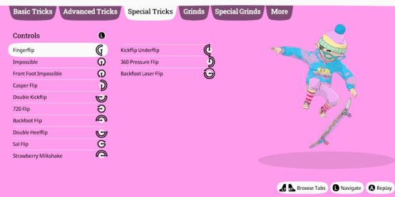 本作上手难度并不高,掌握节奏之后,基础动作很容易学会。但随着技术的精进,游戏中还包含了大量难度系数极高的动作,很像格斗游戏中的“搓招”,需要在恰当的时机搓摇杆,才能使出这些观赏性极强的动作。