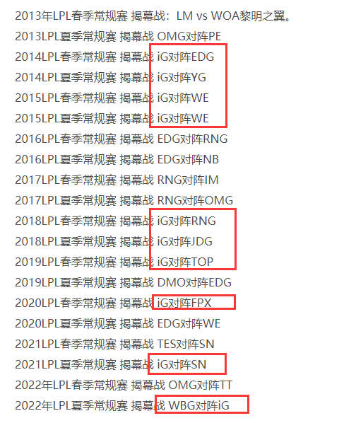 而说到IG和WBG这场揭幕战,这也是IG战队第十次参加LPL揭幕战,他们也成为LPL历史上参加揭幕战次数最多的战队!自S3赛季以来,LPL常规赛揭幕战对阵如下: