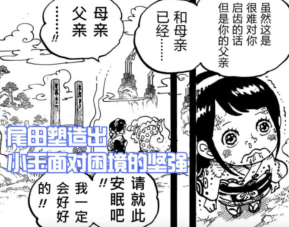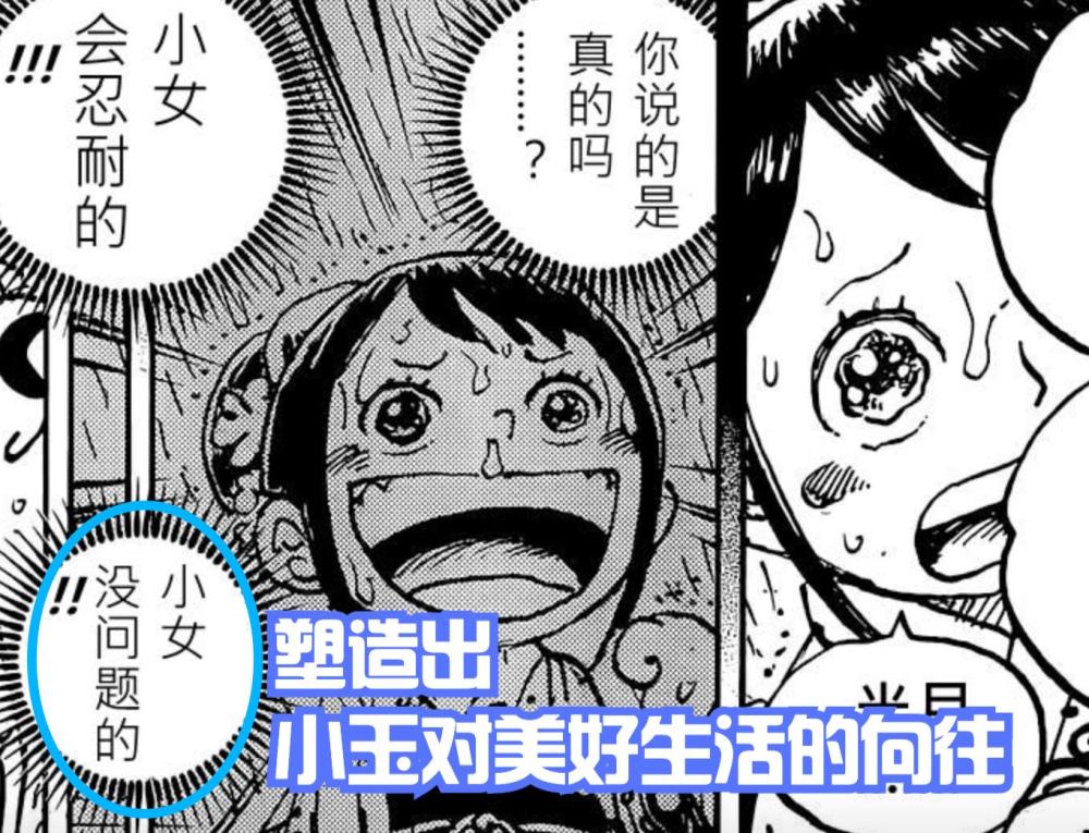 小玉可以说是和之国篇的核心,她的塑造很完美。从小玉将自己的食物全部让给路飞吃时,体现出她对待恩人的态度,这也让路飞想要小玉拥有一个能够吃得饱的国家,与当年艾斯所说的话对应上,尾田将细节做到极致。