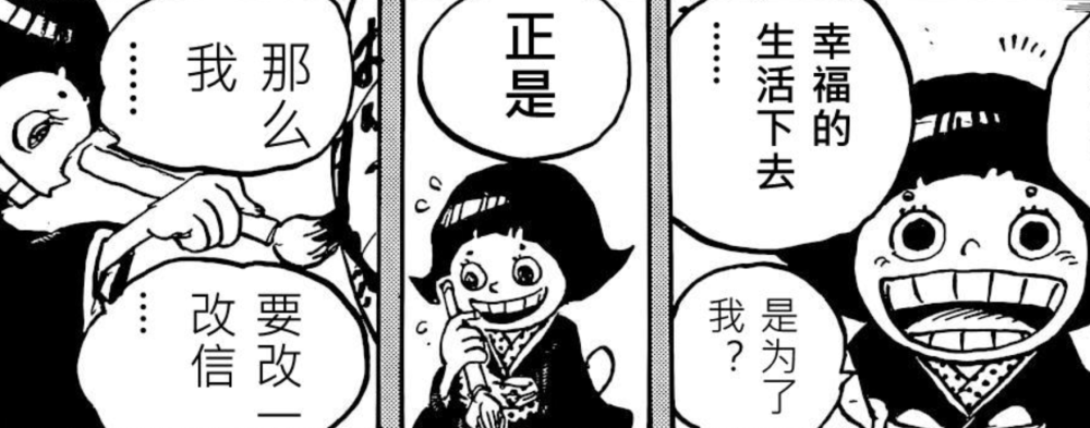 小南子的塑造更多的是她对父亲康家的爱意,以及在1050话她知晓父亲是为了这个国家的希望以及未来自己能够更好的生活而牺牲的,这让小南子内心仿佛觉醒了一般。
