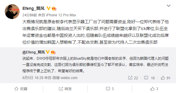那么,具体细节又是什么呢?近日,翼风就此事再一次透露,“大概情况就是原老板李代表(DWG原老板)显示器工厂出现了问题需要资金,刚好一位郑代表给了他出售俱乐部的建议,随后由兰天(中国老板)买下俱乐部,并进行了联盟化拿到了LCK席位。队伍全年运营资金也都是由中国投资人出的。但随着队伍成绩越来越好以及联盟化成功后,席位价值的增加导致韩国人想赖账了,不配合交割,甚至作为代持人想二次出售俱乐部。”简单来讲,就是DWG原老板做了一件“卸磨杀驴”的不厚道事情,由中国人投资的队伍打出成绩之后,一脚把投资人踢开,不承认这个投资人的同时,还想将已经升至的队伍出售出去。