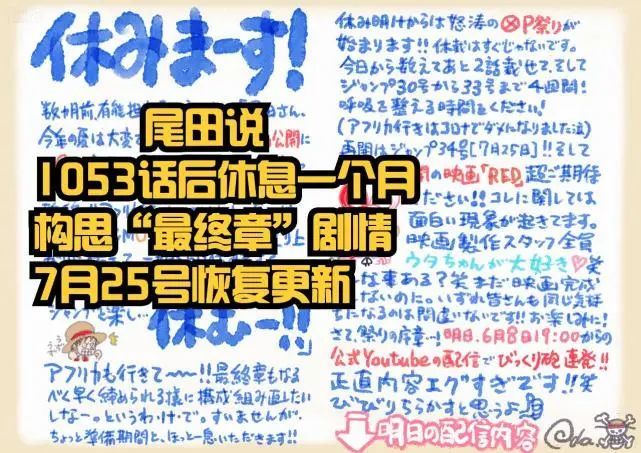 尾田连载一个月漫画,如今需要休息一个月