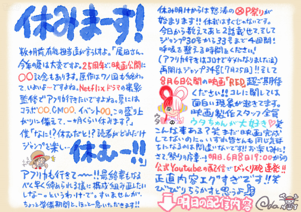 而此次突发地宣布休刊一个月,官方也在及时发布的公告中给出了解释,总结起来就是尾田接下来的工作实在太忙了。