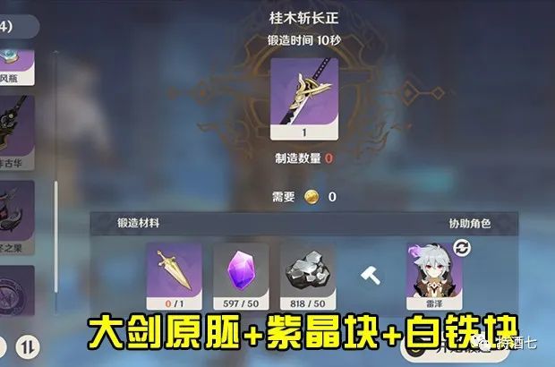打造所需材料:1把大剑原胚、50块紫晶块、50个白铁块。