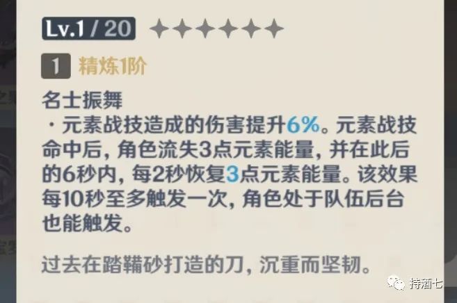 注2:名士振舞(1阶)元素战绩造成伤害提升6%。元素战绩命中敌人,角色流失3点元素能量,此后6秒内,每2秒恢复3点元素能量。该效果10秒触发一次,及时持剑角色在后台,也能触发被动效果。