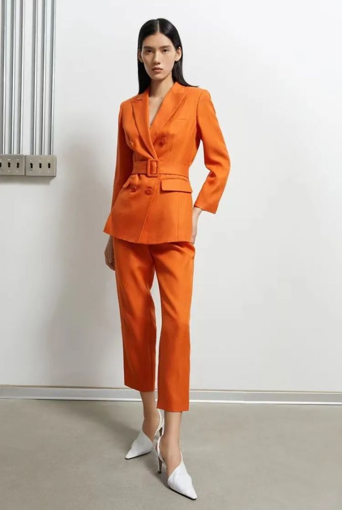 一整套橘色的西装穿上身,瞬间摆脱了老干部的画风,转变成时装博主既视感。配上简单的白色高跟鞋诠释低调的时尚,同时又将自己大长腿的优势凸显出来,满满的小心机呢。