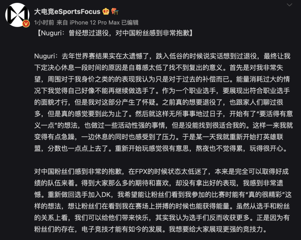 从这篇采访文中,Nuguri提到当时选择休息的原因是“自尊感太低了找不到复出的意义”,可以感觉到S11的失利对于Nuguri的打击还是很大的,甚至萌生了退役的想法。对于LPL粉丝他也表示抱歉“对中国粉丝们感到非常的抱歉,在FPX的时候状态太低迷了,本来是完全可以取得好成绩的队伍来着。得到大家那么多的期待和喜欢,却没有拿出好的表现,我感到非常遗憾”。
