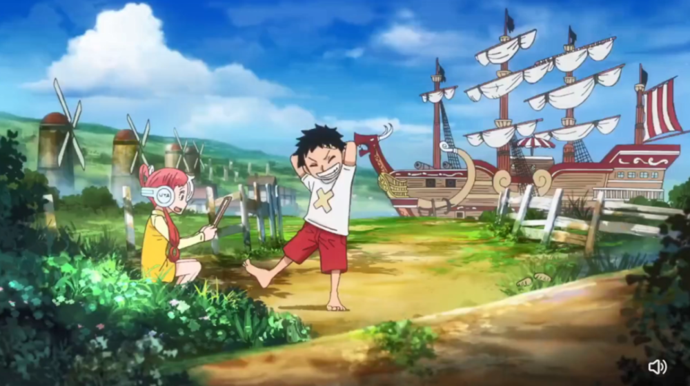 之后一段时间里,在路飞不断地进攻下,开始和歌姬成了朋友,画面里还有香克斯的船停在风车村,