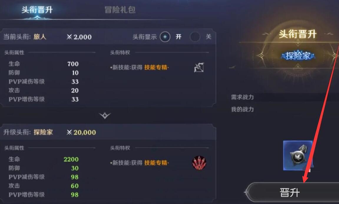 接着,弹出头衔面板,点击右下角的晋升,即可