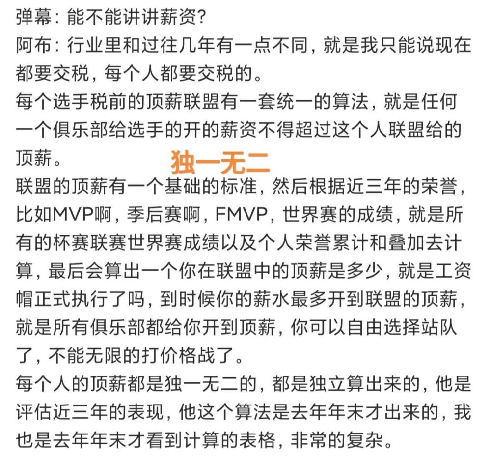 同时,阿部还表示每个人的顶薪都是独一无二的,都是独立算出来的,他是评估近三年的表现,他这个算法是去年年末才出来的,我也是去年年末才看到计算的表格,非常的复杂。看得出来,联盟官方为了调整整个lpl的生态环境,确实做出了太大的改变了。
