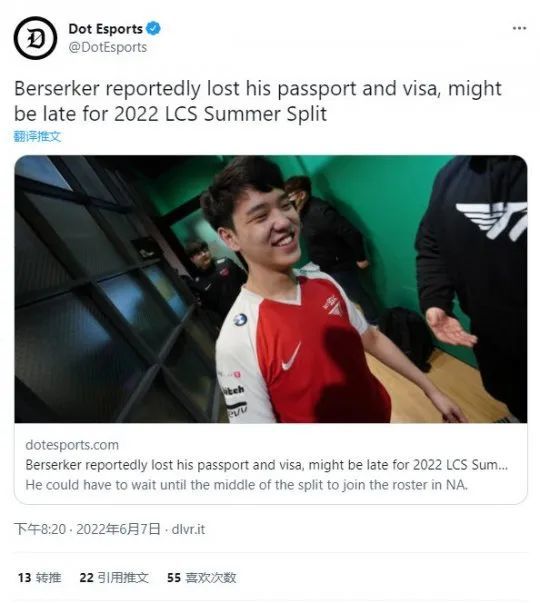 目前距离LCS的夏季赛开始已不足半个月,首发AD选手Berserker却因为护照和签证都丢了,难以及时归队。按照外网的说法:“Berserker必须拿到新护照,而且他还必须重新申请美国签证的一切,这通常需要四到五周,有时是六周……”