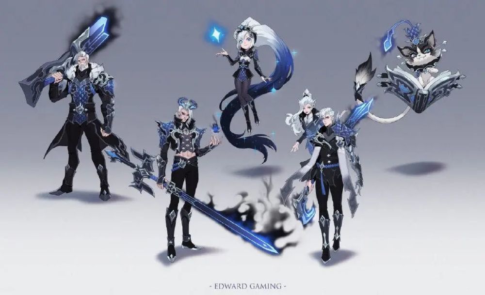 【无处不在的国风元素】EDG电子竞技俱乐部选手们给出5个关键词:龙、骑士、铠甲、暗黑、反派,设计师团队提炼出“暗黑、前卫、反派”的大方向,3位概念设计师进行了早期概念探索,方案以银龙骑士和龙鳞铠甲为基础,加入了云雷纹和蟠螭纹等大量中国元素,无处不在的龙形,搭配S11的蓝,最终脱颖而出被选中(猫咪概念是用Vlad的)。