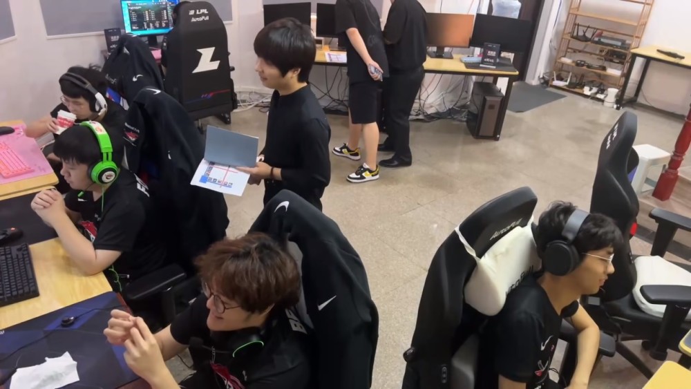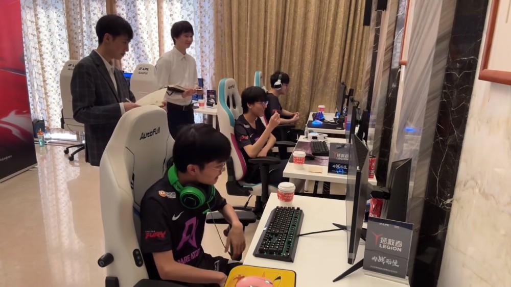 过程中可以看到AL几个选手的基地,环境可以用非常简陋四个字来形容,使用的是最传统的那种非常简单的电脑桌,甚至让很多观众想起了上学时候的课桌。
