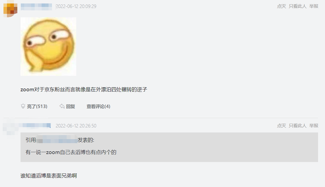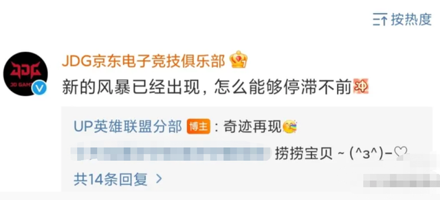 在看到JDG官博为了Zoom跑到UP的微博下互动后,有LPL观众发帖表示:“这就是京东的人情味。”而帖子配图则是JDG与UP两支队伍官博的互动,在评论区JDG粉丝也是直言道:“zoom对于京东粉丝而言就像是在外漂泊四处辗转的逆子。”