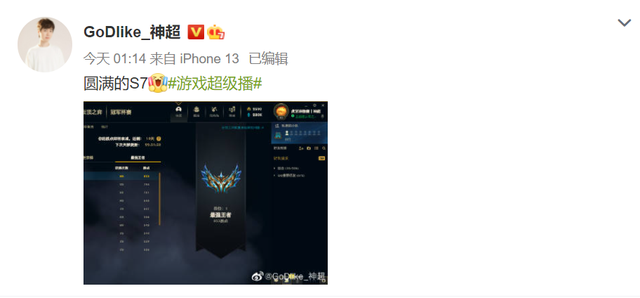 而且神超在每次版本更新都能迅速找到胜率高的阵容、套路,甚至还会偶尔自己开发一些阵容推荐给玩家,这也让神超在玩家圈子中备受好评。随着云顶热度堪称火爆的S7赛季上线,没过多久身为虎牙主播的神超就再次打上了国服第一,并且为此他还激动发博留作纪念:“圆满的S7。”