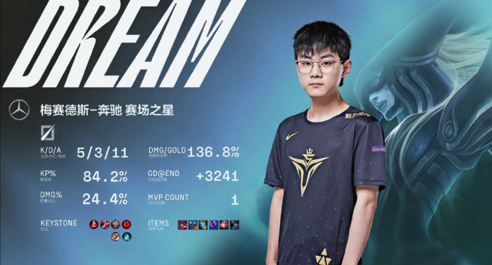 Dream两局比赛除了对线有些欠缺,团战打得还是不错的,尤其是第二局,他的冰女团战限制妖姬的发挥,配合队友完成了多次团战收割。这样的表现也让Dream获得首个LPL赛场MVP。