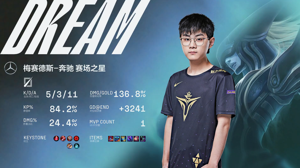 在拿到大龙之后,V5顺利滚起雪球。虽然后续的第二条大龙被TT抢下,但却并不影响比赛的局面。最终,V5依旧是有惊无险拿下了第二局比赛,取得了最后的胜利。而新人小将Dream,则是拿到了这局比赛的MVP。