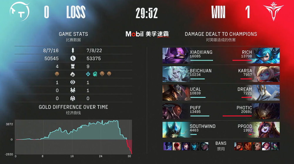 而凭借着阵容前期的主动与强势,TT打出了一波8-3的不错的开局。但是,因为TT这套阵容缺少关键的前排,在Xiaoxiang凯南无法寻找到更好的位置进场时,TT并无法找到机会将优势扩大。反倒是V5稳扎稳打,成功拖到了自己关键C位都有了关键的装备。在比赛时间26分钟左右的时候,V5的上单Rich突然发难,V5成功“击杀”掉了TT的上单与ADC。在这样的情况下,V5顺利拿到了大龙。而在拿到大龙之后,V5凭借着阵容后期的团战能力一波结束掉了比赛。可以说,这一局比赛有些戛然而止的意味,TT新阵容因为磨合问题以及执行力问题导致了自己仍处在优势的情况下却无法打赢团战。